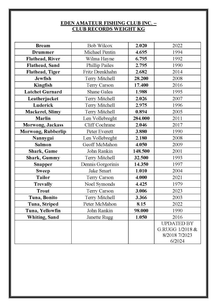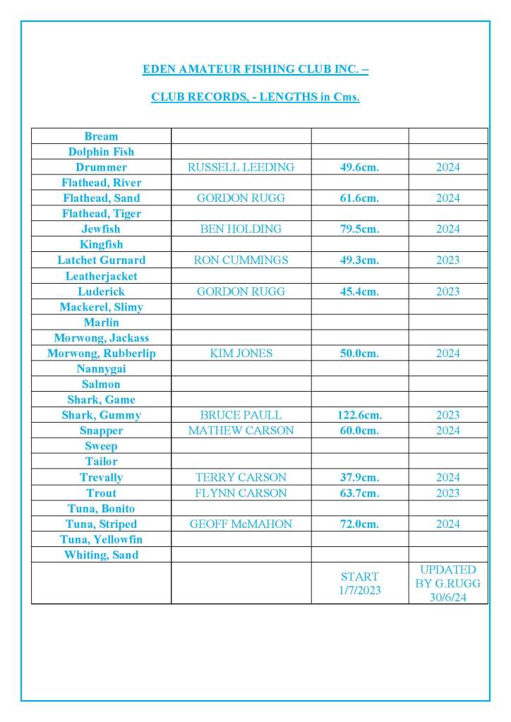 30/6/2025 Club Length & Weight Records
