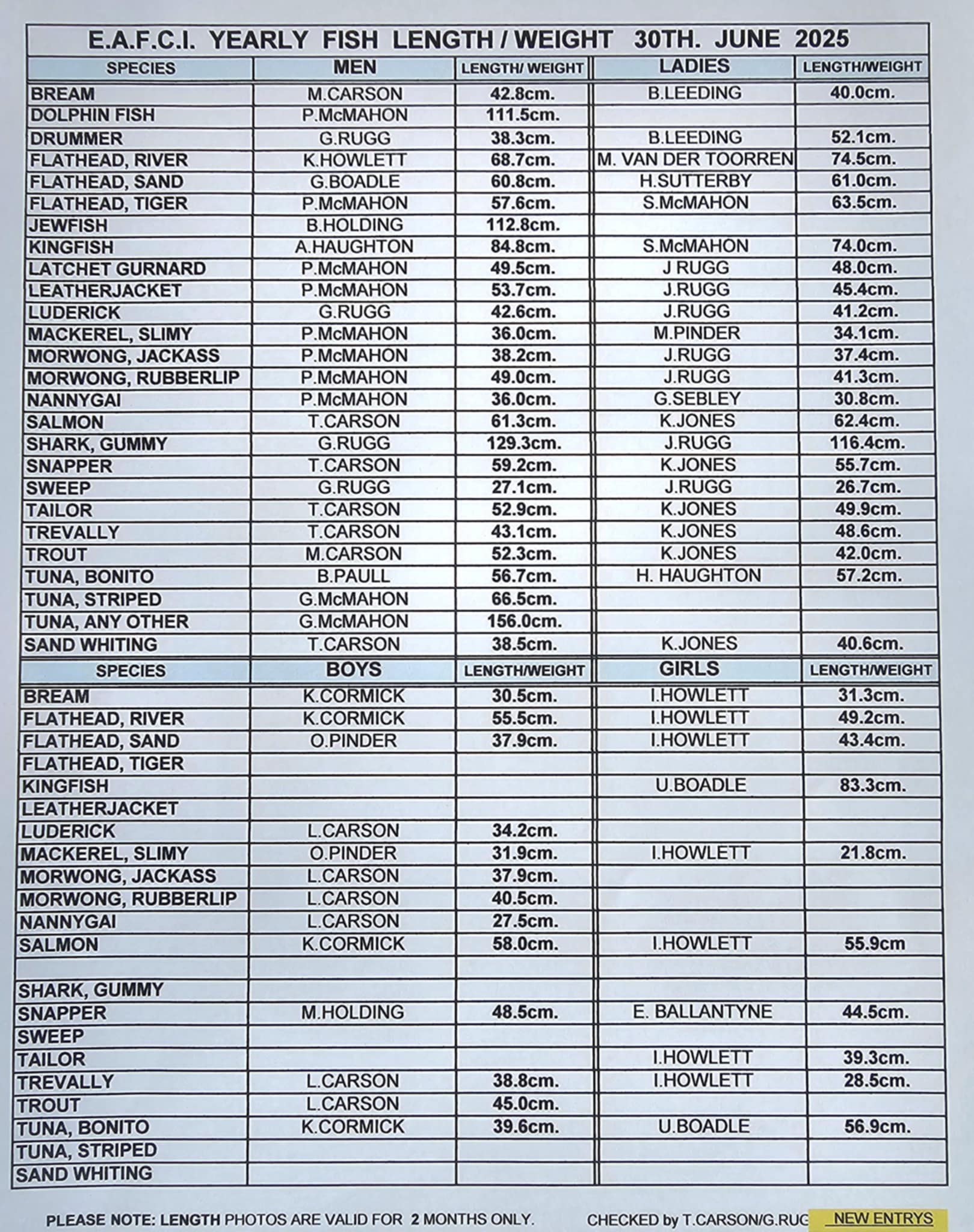 1/7/24 – 30/6/25 Fish Lengths 2025 Results